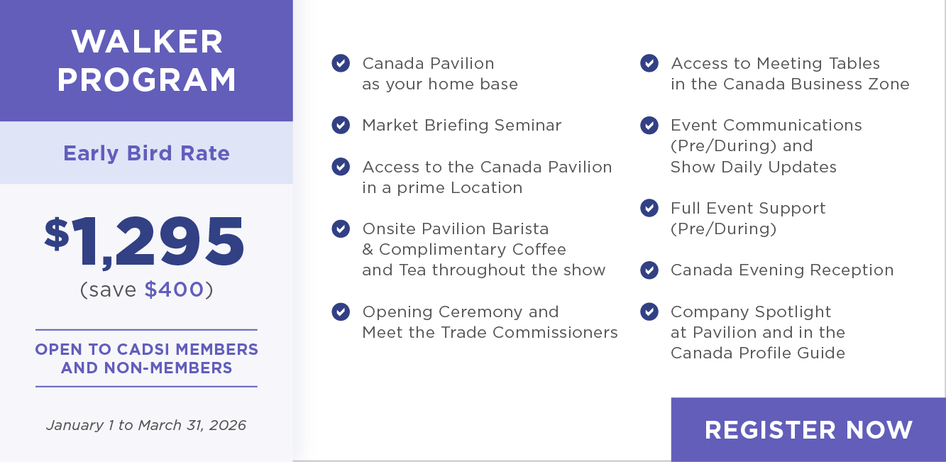 - Your company listing and profile are portrayed in the Canada Pavilion and the published Profile Guides.
